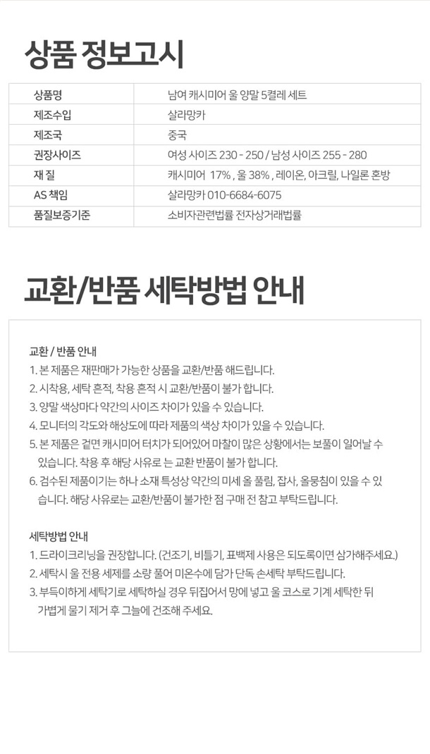 *상품명 : 포쉬에르 캐시미어 양말 5족세트
