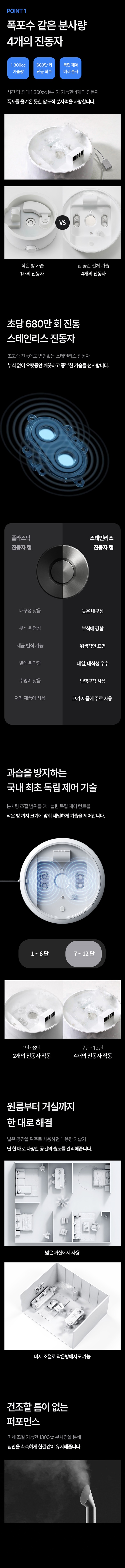 1. 진동자가 4개 탑재되어 풍부한 분사량(최대 1300ml/h 이상)을 제공하며, 1~12단 미세 조절 기능으로 환경에 맞는 세팅이 가능하다.