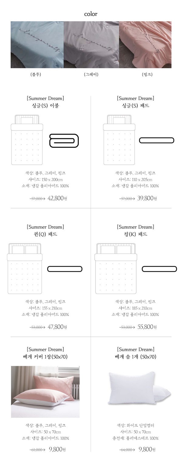 *색상 : 이불, 패드, 베개커버 : 블루, 그레이, 핑크 / 베개솜 : 단일컬러