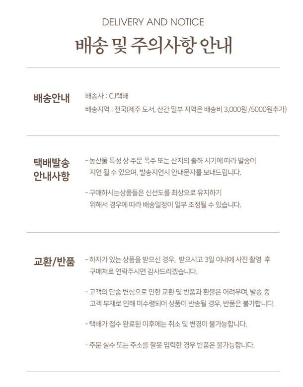 · 배송은 입금확인된 날짜로부터 1~3일 소요되며 최대 7일 이내 출고됩니다. ( 공휴일, 기상악화 등 불가피한 상황에 따라 추가 지연될 수 있습니다.)