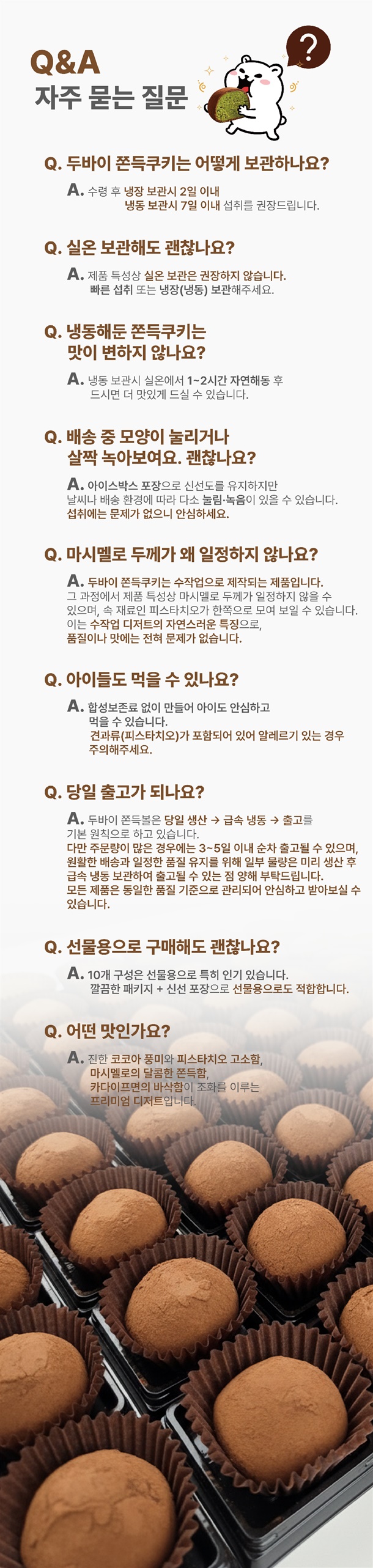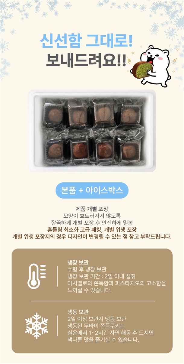 두바이 쫀득쿠키는 하루 생산량이 한정되어 있습니다. 현재 주문폭주로 인하여 순차출고 예정으로 배송이 최대 2주정도 추가로 지연될 수 있는점 양해부탁드립니다.