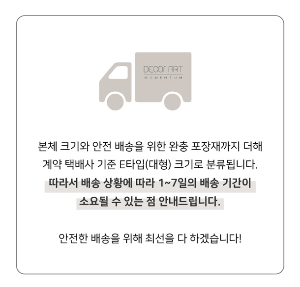 · 배송은 입금확인된 날짜로부터 1~3일 소요되며 최대 7일 이내 출고됩니다. ( 공휴일, 기상악화 등 불가피한 상황에 따라 추가 지연될 수 있습니다.)