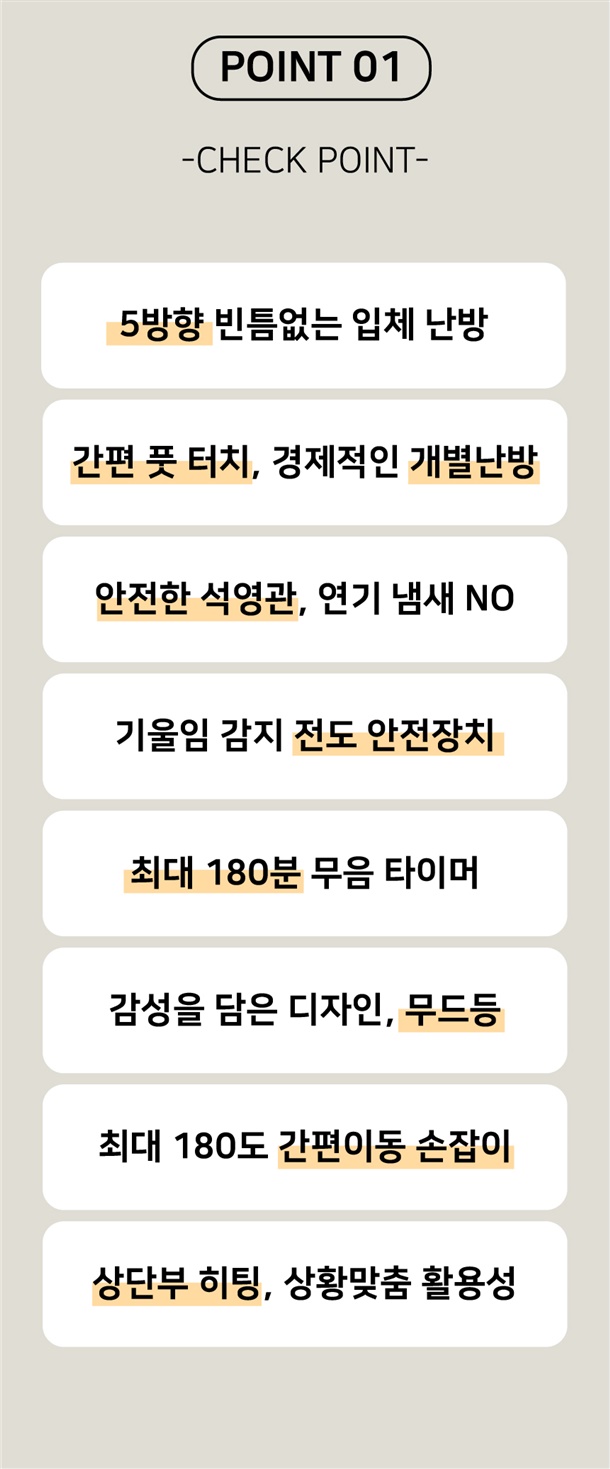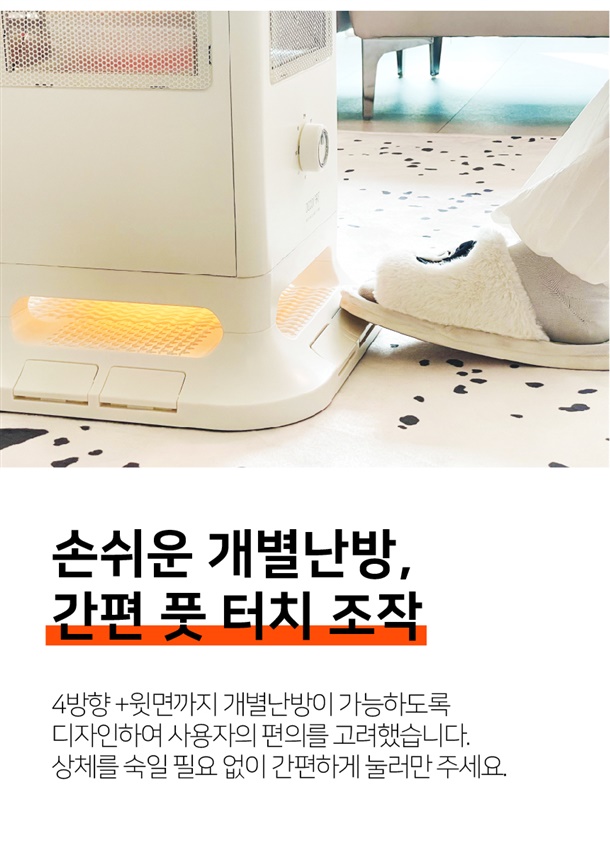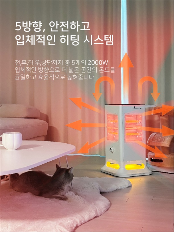 5방향으로 강력한 난방을 누릴 수 있는 입체난방 전기난로입니다.