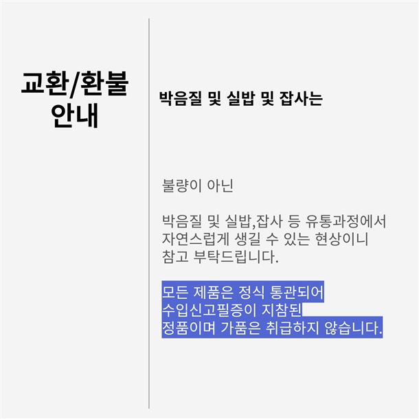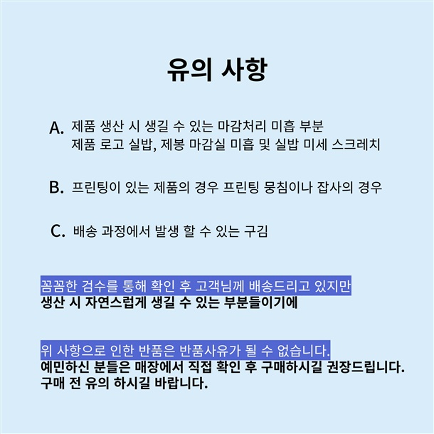 · 상품 불량 사유와 사진을 남겨 주시면 빠른 처리가 가능합니다.