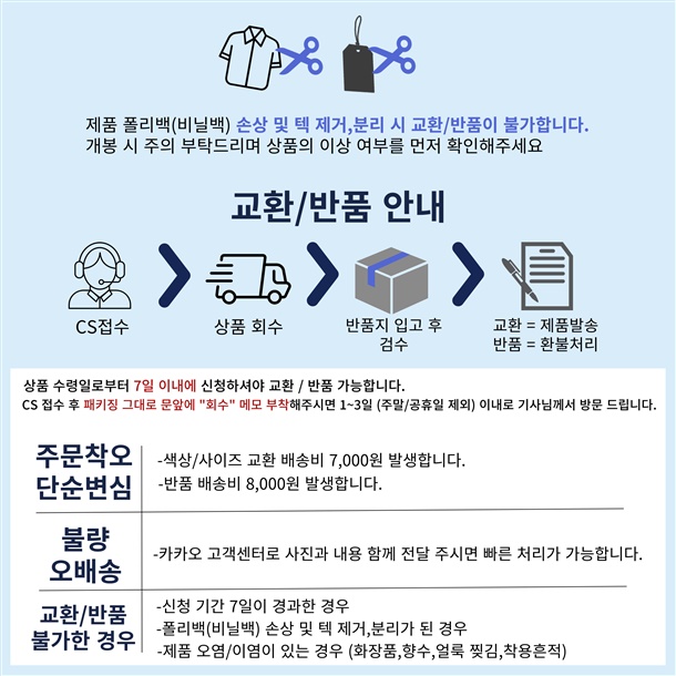 · 교환/반품 신청은 배송완료 후 7일 이내에 가능합니다.