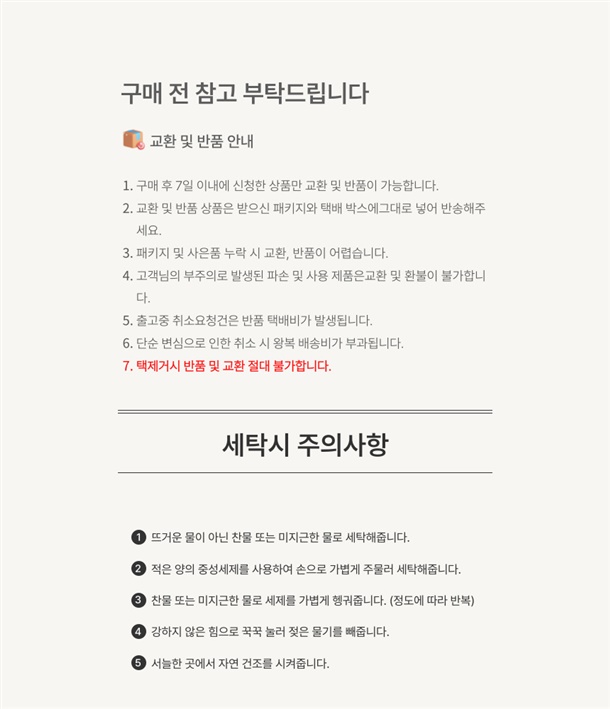 · 교환/반품 신청은 배송완료 후 7일 이내에 가능합니다.